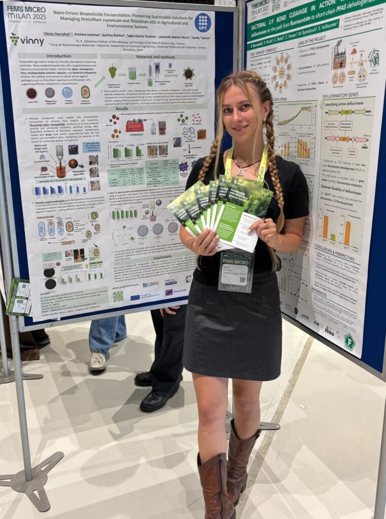 Відділ біології екстремофільних мікроорганізмів – наукова співробітниця Олеся ГАВРИЛЮК у співавторстві з колегами з Universitat Politècnica de Catalunya (Барселона, Іспанія) представила постер, присвячений розробці стійких нанобіопестициди (NanoBPs) на основі нанотехнологій для інкапсуляції біоактивних сполук на екологічно чистих носіях – «Nano-driven biopesticide encapsulation: pioneering sustainable solutions for managing Penicillium expansum and Rhizobium vitis in agricultural and environmental systems». NanoBPs продемонстрували виражену протигрибну та антибактеріальну активність щодо Penicillium expansum та Rhizobium vitis.