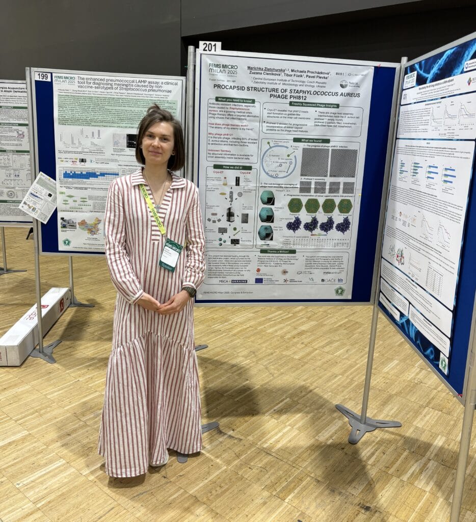 Відділ молекулярної генетики бактеріофагів – наукова співробітниця Марічка ЗЛАТОГУРСЬКА у співавторстві із колегами з Central European Institute of Technology (Чехія, Брно) представила постер, присвячений дослідженню структури бактеріофага Staphylococcus aureus phi812 – «Procapsid structure of Staphylococcus aureus phage phi812». В результаті дослідження було ідентифіковано три окремі класи із варіативним складом мінорних білків капсида. Отримані дані становлять важливу інформацію про процес формування головки фага phi812.