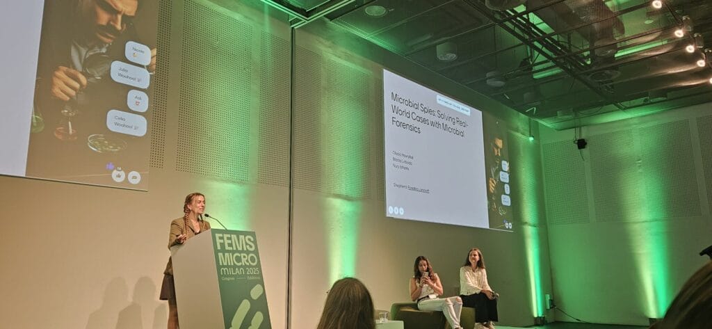 У фінальний день Конгресу Олеся ГАВРИЛЮК та Марія ЛОБОДА провели спільно з колегою з Іспанії Nury Infante інтерактивну сесію “Microbial spies: Solving real world cases with microbial forensics”, що зібрала понад 200 учасників. Ведучі ознайомили учасників із світовими напрацюваннями з цієї тематики, а також представили розробки Інституту щодо використання мікроорганізмів як біоіндикаторів для діагностики ґрунтів, пошкоджених внаслідок воєнних дій в Україні. Після цього відбулося жваве обговорення з аудиторією, яке завершилося інтерактивною командною грою: учасники, розділені на команди, розслідували реальні випадки з використанням мікробіологічних знань.